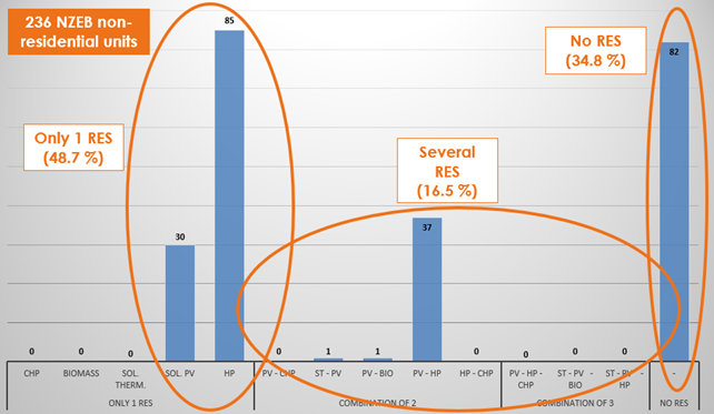 Figure 2. The number of non-residential built NZEB units and use of RES by the end of 2019.
