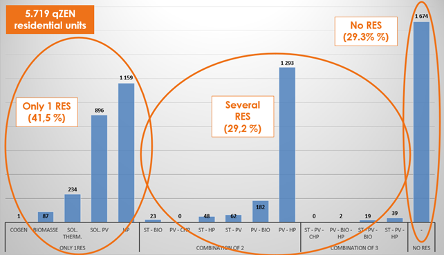 Figure 1. The number of residential built NZEB units and use of RES by the end of 2019.