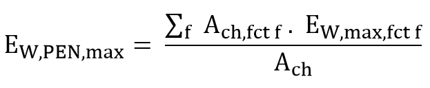 with: EW,PEN,max the threshold for the EW level of the studied PEN unit (dimensionless); Ach, fct f the total heated floor area of each function f of the PEN unit, in m²; EW, fcf f the assumed requirement level per function, for each function f of the PEN unit (dimensionless); Ach the total heated floor area of the studied PEN unit, in m². |