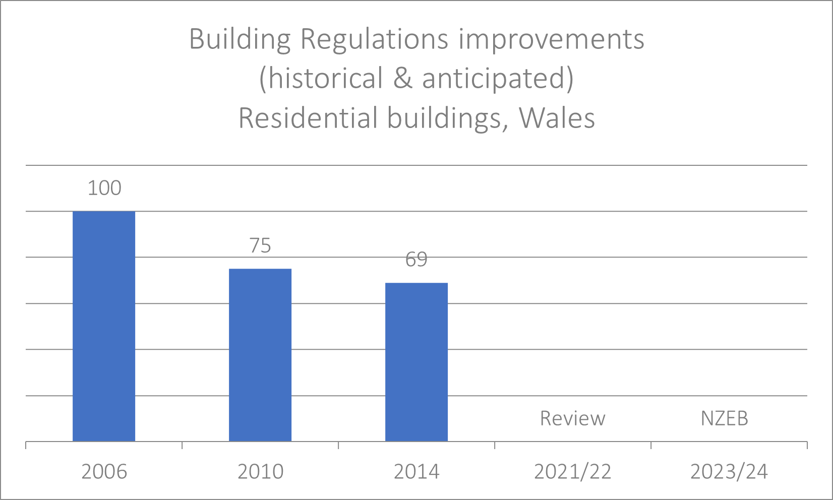 Figures 1 and 2 show simplified historical Building Regulations improvements in Wales for new buildings. The graphs are based on the 2006 Regulations (the reference year), historical improvements for 2010 and 2014, and Government announcements for 2017 and 2020. Note that the 2006 and 2010 Regulations applied across England and Wales, whereas the 2014 Regulations apply to Wales only, following the devolution of powers to the Welsh Government in 2011.