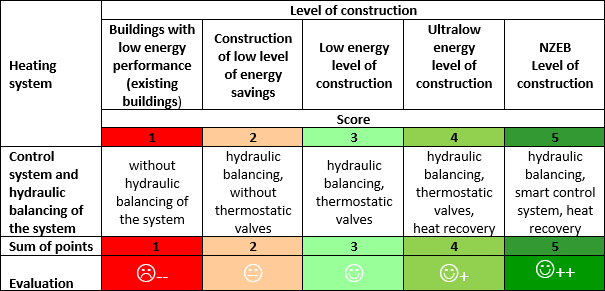 Requirements for the evaluation of the heating system are set for individual levels of construction, depending on the method of the control system and hydraulic balancing of the system (Table 2). The evaluation of the DHW system is performed according to the type of batteries and the distance between the DHW supply shut-off valve and the farthest battery, as well as by comparing the actual and required thermal insulation thickness of DHW distributions in the individual part of the building. For example, an individual part of the building meets the requirements for nearly zero energy if there is a smart control system of the heating system installed and DHW distributions are insulated using thermal insulation with a thickness over the diameter of the pipe.
