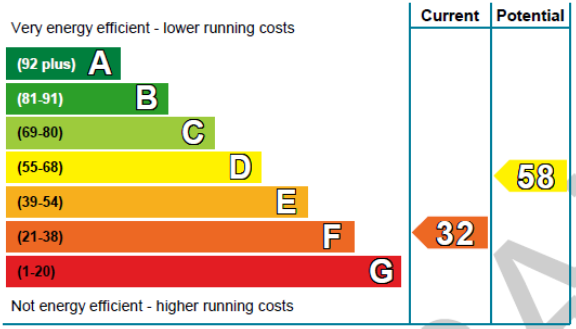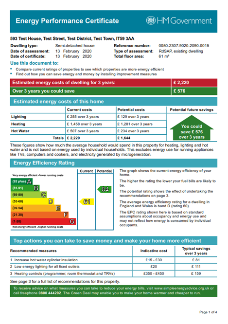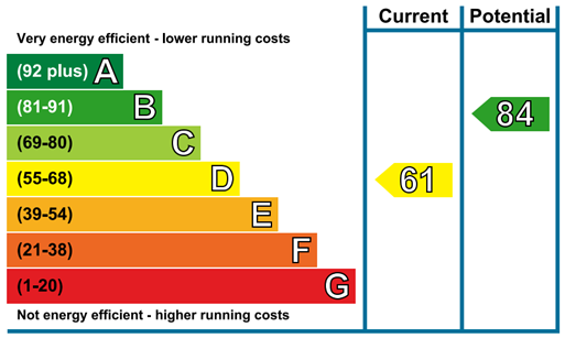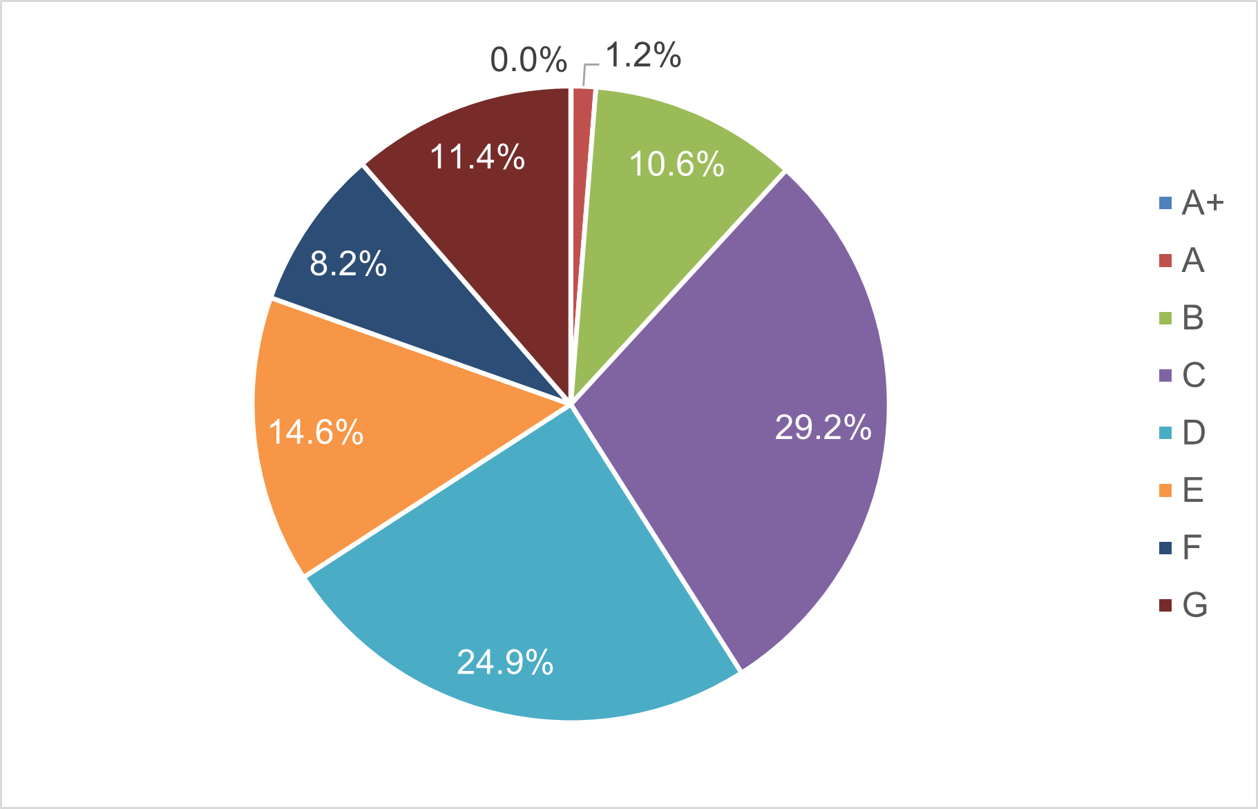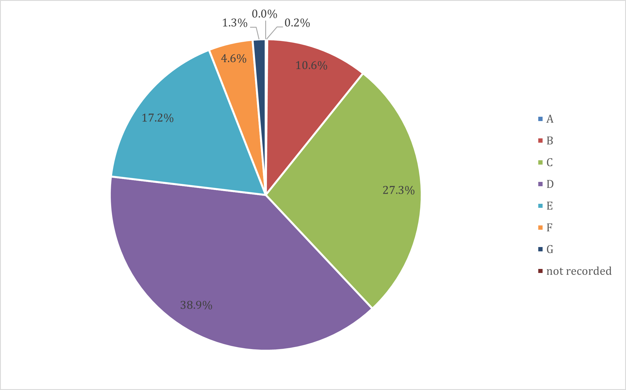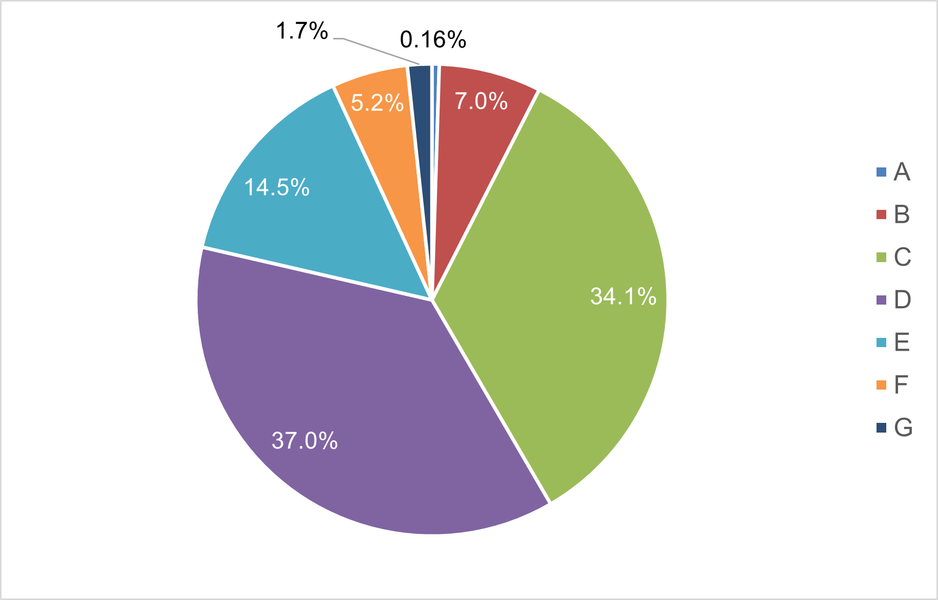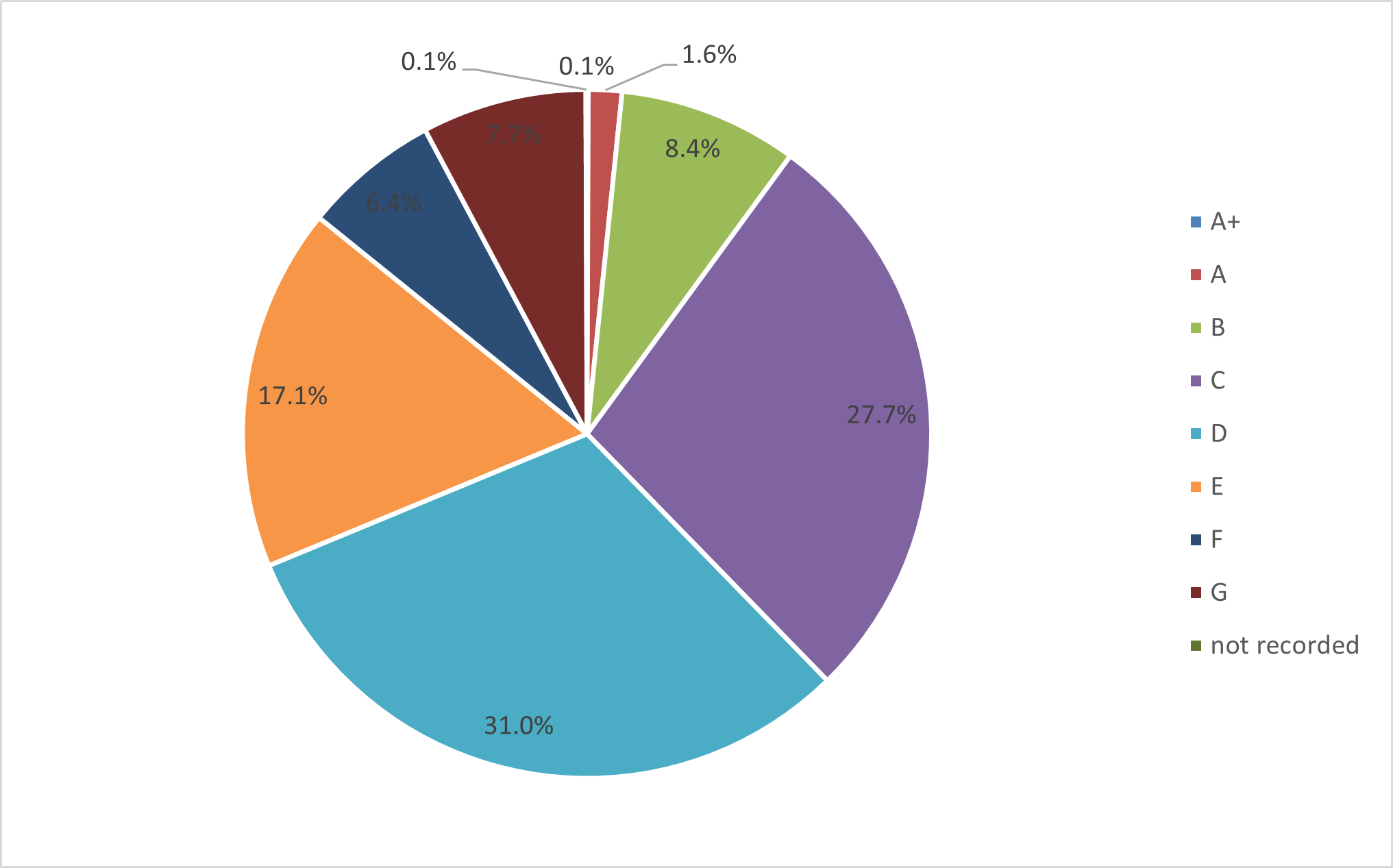 The EPC shows the “Asset Rating” (i.e. a calculated energy rating) of the current and potential energy efficiency of the building on a scale from A (very efficient) to G (least efficient) (Figure 10). The rating is based on the building’s characteristics, its services, a standardised occupancy profile and estimated energy consumption costs. The average domestic EPC rating is 60, which is in band D. The average EPC rating for a new domestic property is 81, which is in band B.