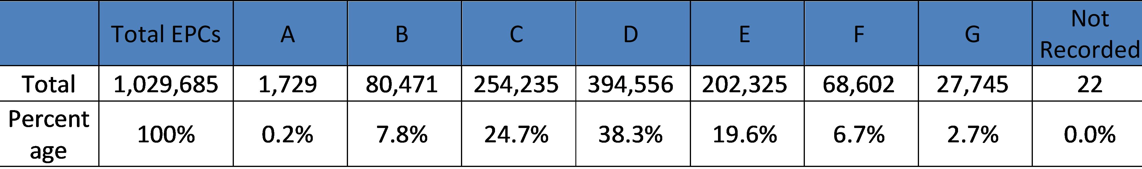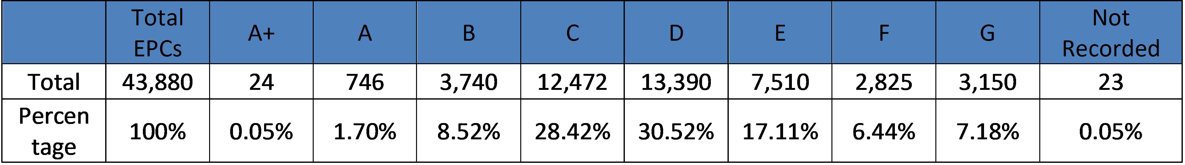 Until 2012, only EPCs for existing domestic units were recorded on the Scottish EPCs register. EPCs for new buildings were submitted to Local Authorities as part of the Building Warrant process, and EPCs for existing non-domestic buildings were not recorded. A new Scottish register16 was implemented in 2013, and EPCs for all buildings have since been recorded. Tables 2 and 3 as well as Figures 12 and 13 show data to December 2019 and reflect these historical arrangements.