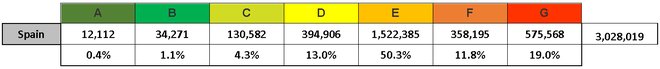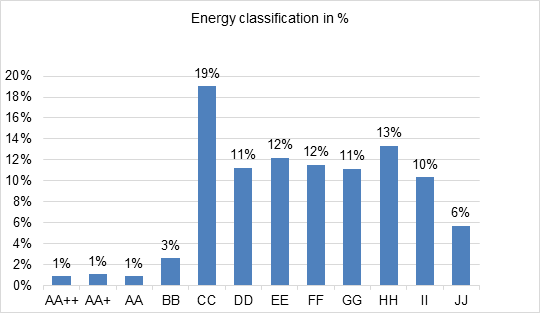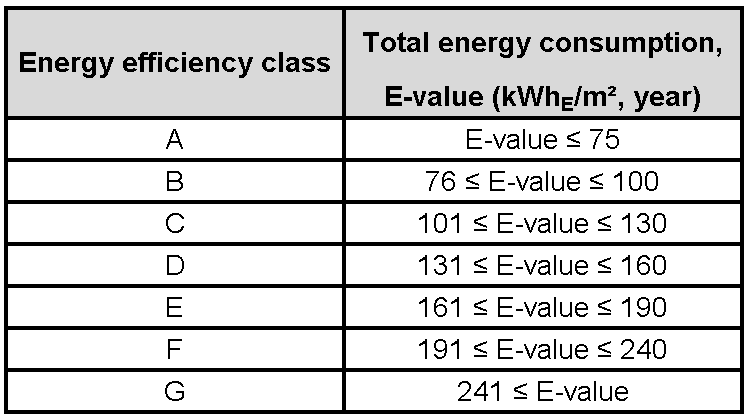 Certification requirements, as well as the format and content of the EPC, are the same for residential, non-residential and public buildings. The energy label classifies buildings on an efficiency scale, ranging from A (high energy efficiency) to G (poor energy efficiency). As an example, the efficiency scale for apartment buildings (2018) is shown in Table 7.
