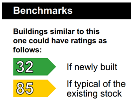 > Domestic buildings: The EPC (Figure 7) shows a calculated rating (asset rating) of the current and potential energy efficiency of the building on a scale from A (most efficient) to G (least efficient). The Energy Efficiency rating is based on the building’s characteristics, its services, standardised occupancy and energy cost. The average rating for a domestic building in Scotland is rating D (63).