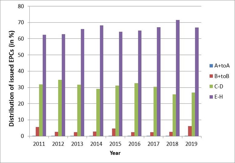 Between June 2010 and late June 2020, more than 600,000 EPCs for existing residential buildings were registered in the database. This represents about 38% of the building stock. It is not possible to know how many EPCs have been issued for building renovations, since it is not a mandatory EPC input data.