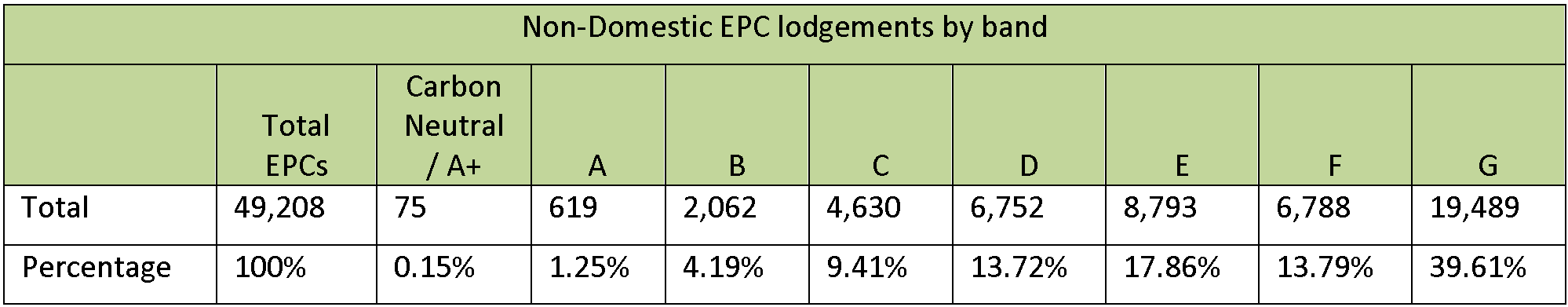 Figure 13. Breakdown of Non-Domestic EPCs by EPC band in Northern Ireland to December 2019.