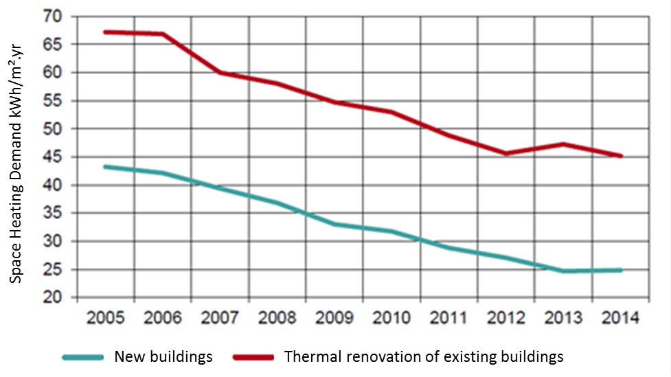 Energy performance is based on overall primary energy consumption (kWhE/m2.year), taking the energy source (primary resource factor) into account. Primary energy factors for energy sources are fixed in the National Building Code as described previously in Table 2.