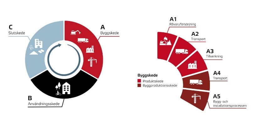 The new Act (2021:787) on Climate Declarations for Buildings establishes the obligation to report the climate impact of the construction of a new building in a climate declaration. The purpose of the climate declaration is to reduce climate impacts from the construction of buildings by highlighting those impacts. The law on climate declarations for buildings limits reporting on emissions to the construction stage, i.e., until the building is completed, see Figure 5. The building elements included in the report are load-bearing structures, the building envelope and interior walls. The climate declaration is a partial Life Cycle Assessment (LCA), but it is still a major change for the construction sector to begin reporting on emissions.