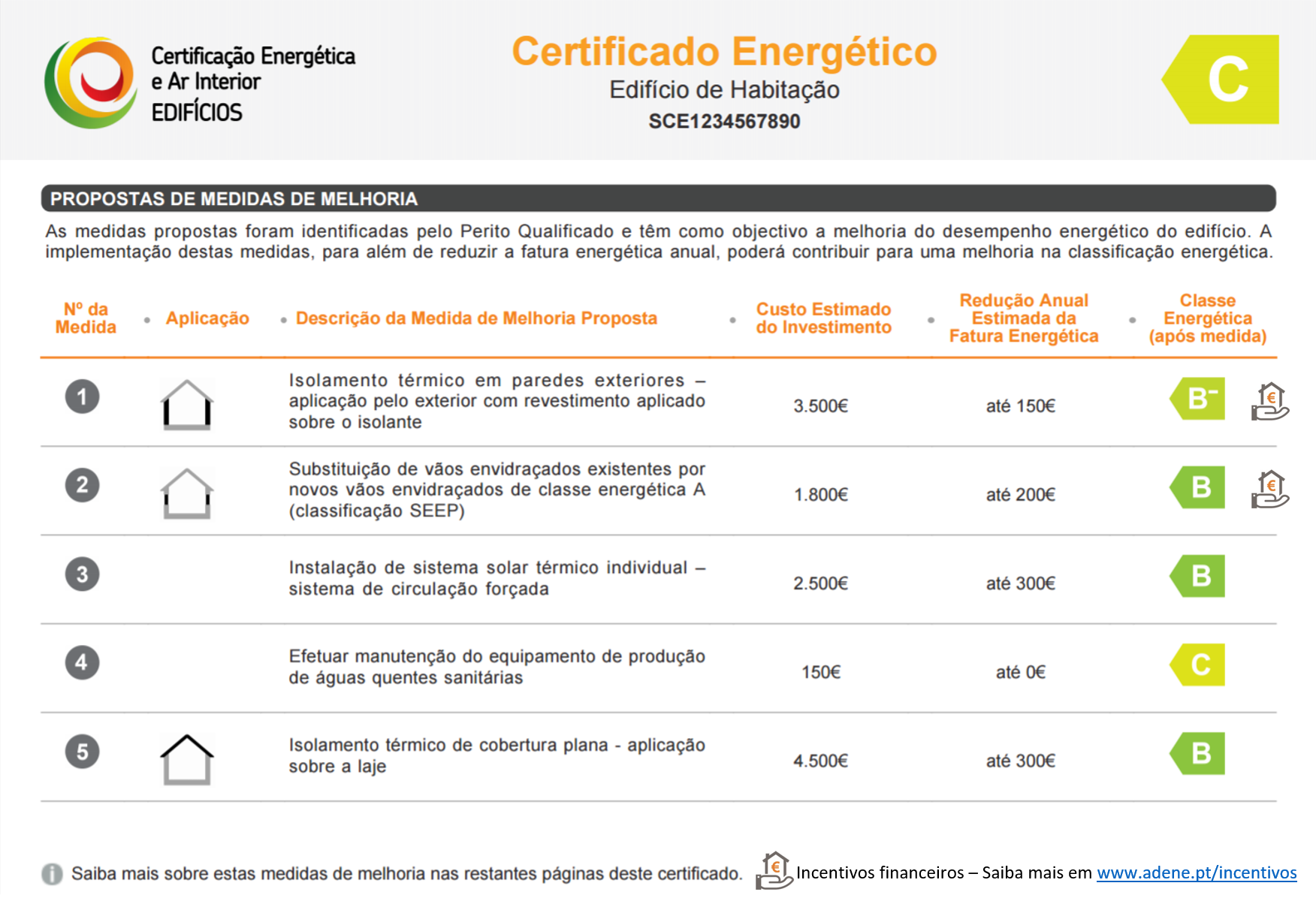 In Portugal, the EPC is a tool that provides access to funding schemes and is also used as a validation mechanism (by the qualified expert) regarding the effectiveness of the implemented recommendations supported by those incentives. In order for the validation to occur, the EPC is issued at the beginning of the process and aims to assess the current status (baseline) of the building. It clearly identifies which building component has to be replaced or renovated, in order to evaluate the future performance of the building and the resulting associated savings, in terms of either energy consumption or monetary value. Because of this, the EPC is a mandatory document for the funding application process. After the construction/renovation phase, a final EPC is issued and is used as a validation and conformity check of the works that were carried out, and also to evaluate new energy indicators and improvements.