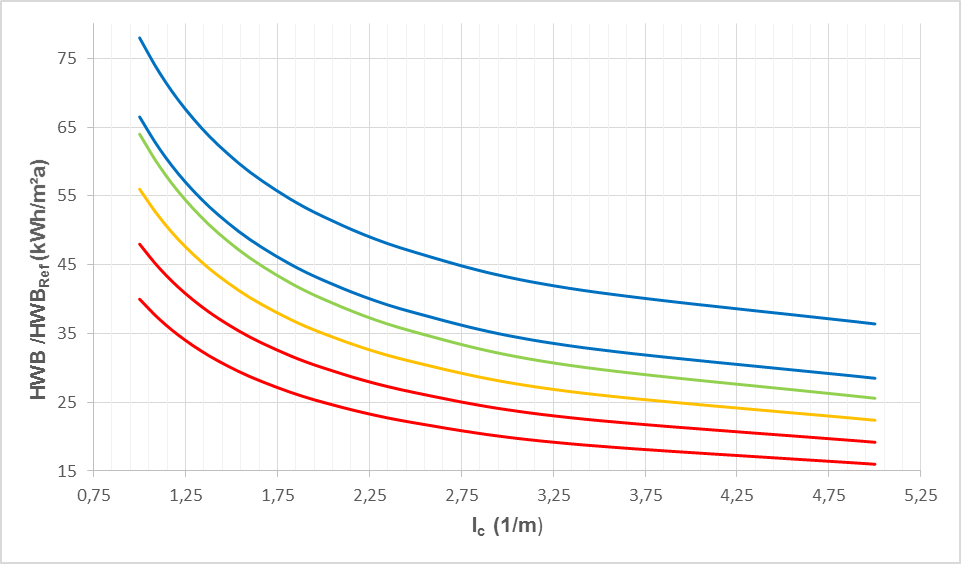 Figure 1. Development of space heating demand requirements for new domestic buildings in the Austrian provinces. Sources: OIB Guideline 6:2007 (blue lines), OIB Guideline 6:2011 (green lines), OIB-GL6:2015 (yellow lines) and OIB Guideline 6:2019 (red lines).