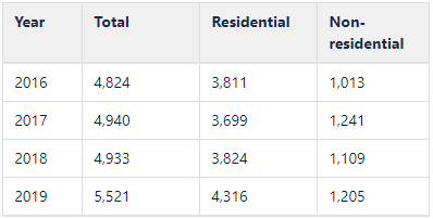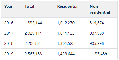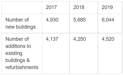 | UK – Scotland | New domestic building completions (Scotland): 2019: 2.3 2018: 1.9 2017: 1.5 New non-domestic building completions (Scotland): 2019: 0.69 2018: 0.76 2017: 0.73 |