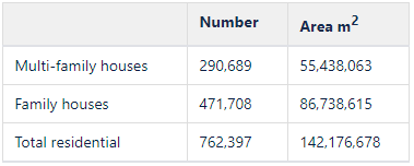 | Norway | 9.2 million m2 (2020) | Statistics Norway (https://www.ssb.no/bygg-bolig-og-eiendom/statistikker/byggeareal/aar) | ||||||||