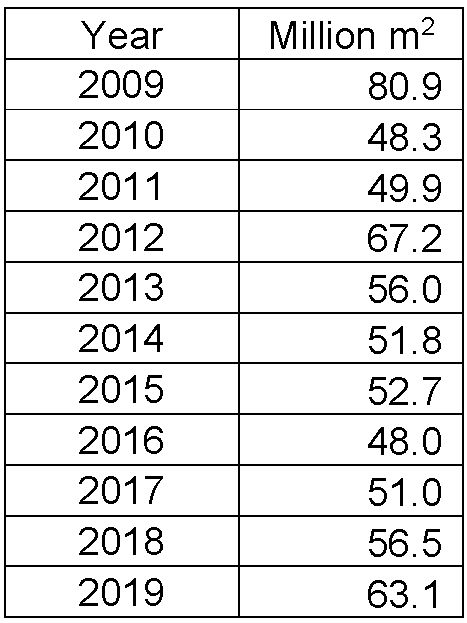Useful floor area of buildings constructed per year in million square meters (estimate) |