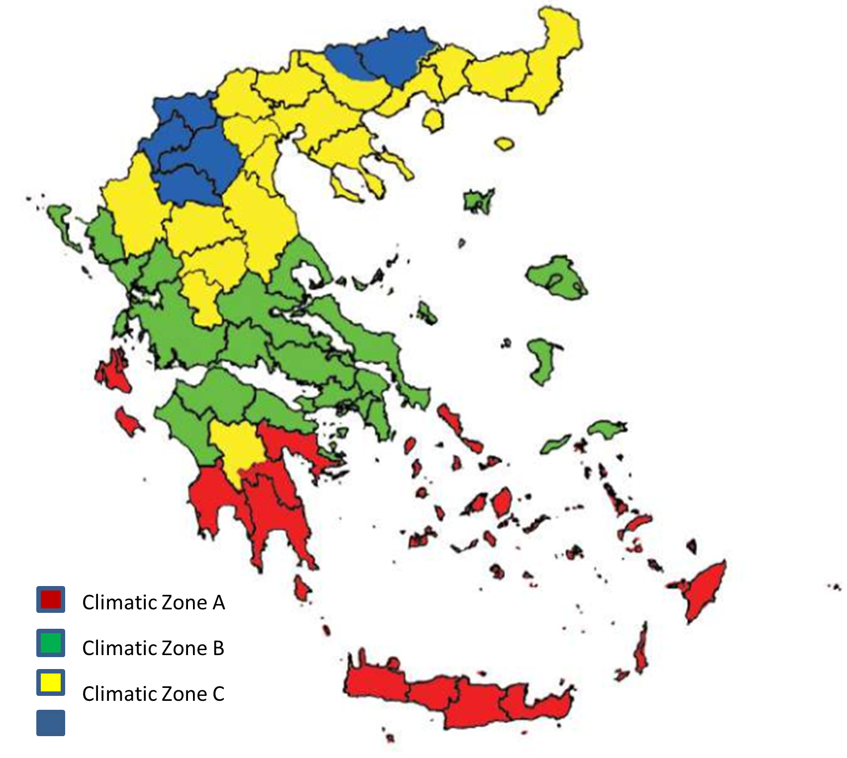 The in July 2017 revised KENAK introduced stricter minimum energy performance requirements regarding new buildings’ components and whole buildings’ envelope. The requirements for existing buildings remained the same. Energy requirements for new buildings are presented in Table 1. Maximum acceptable thermal transmittance values for the building envelope of new buildings are presented in Table 2, according to the 4 climatic zones of Greece (Figure 1).
