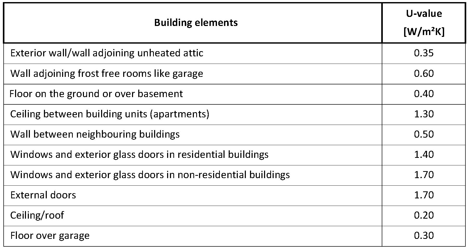 Requirements for building components are the same for new buildings as for renovations. Walls, windows and other parts of the building envelope must meet U_max/R_min requirements, which are listed in Table 3.