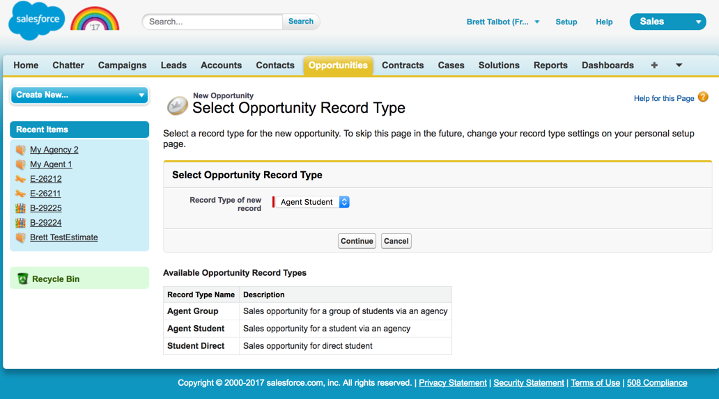 Either navigate to the Agent account record, then scroll to the opportunities section (or click on the Opportunities link at the top of the account record) and select New Opportunity.