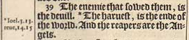39 The enemie that sowed them, is the deuill. *The haruest, is the ende of the world. And the reapers are the Angels.[*Ioel.3.13. reue,14.15]