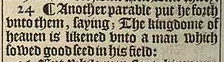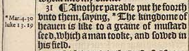31 ¶ Another parable put he foorth vnto them, saying, *The kingdome of heauen is like to a graine of mustard seed, which a man tooke, and sowed in his field.[*Mar.4.30 luke 13.19]