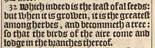 32 Which indeed is the least of al seeds: but when it is growen, it is the greatest among herbes, and becommeth a tree: so that the birds of the aire come and lodge in the branches thereof.
