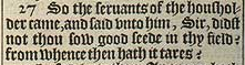 27 So the seruants of the housholder came, and said vnto him, Sir, didst not thou sow good seede in thy field? from whence then hath it tares?