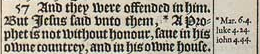 57 Und sie waren durch ihn verleitet. Aber Jesus sagte zu ihnen *"Ein Prophet ist nicht ohne Ehre, außer in seinem eigenen Land und in seinem eigenen Haus."[*Markus 6:4 Lukas 4:24 Johannes 4:44]