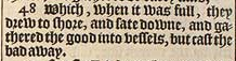 48 Which, when it was full, they drew to shore, and sate downe, and gathered the good into vessels, but cast the bad away.