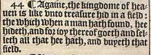 44 ¶ Againe, the kingdome of heauen is like vnto treasure hid in a field: the which when a man hath found, hee hideth, and for ioy thereof goeth and selleth all that hee hath, and buyeth that field.