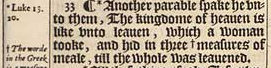 33 ¶ *Another parable spake he vnto them, The kingdome of heauen is like vnto leauen, which a woman tooke, and hid in three +measures of meale, till the whole was leauened.[*Luke 13.20. , +The worde in the Greek is a measure conteining about a peck and an halfe, wanting litle more then a pinte.]