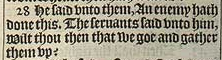 28 He said vnto them, An enemy hath done this. The seruants said vnto him, Wilt thou then that we goe and gather them vp?