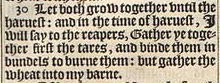 30 Let both grow together vntil the haruest: and in the time of haruest, I will say to the reapers, Gather ye together first the tares, and binde them in bundels to burne them: but gather the wheat into my barne.