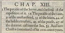 3 Die Parabel des Säers und der Samen: 18 die Erläuterung davon. 24 Die Parabel von den Unkräutern, 31 vom Senfsamen, 33 von der Hefe, 44 vom versteckten Schatz, 45 von der Perle, 47 vom Schleppnetz, in die See geworfen, 53 und wie Christus von seinen eigenen Landsleuten verachtet wird.