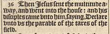 36 Then Iesus sent the multitude away, and went into the house: and his disciples came vnto him, saying, Declare vnto vs the parable of the tares of the field.