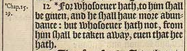 12 *For whosoeuer hath, to him shall be giuen, and he shall haue more abundance: but whosoeuer hath not, from him shall be taken away, euen that hee hath.[*Chap. 15:29]