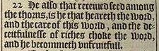 22 He also that receiued seed among the thorns, is he that heareth the word, and the care of this world, and the deceitfulnesse of riches choke the word, and he becommeth vnfruitfull.