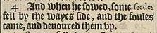 4 And when he sowed, some seedes fell by the wayes side, and the foules came, and deuoured them vp.
