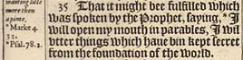 35 That it might bee fulfilled which was spoken by the Prophet, saying, *I will open my mouth in parables, I wil vtter things which haue bin kept secret from the foundation of the world.[*Psal.78.2.]
