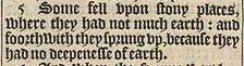 5 Some fell vpon stony places, where they had not much earth: and foorth with they sprung vp, because they had no deepenesse of earth.