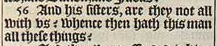 56 And his sisters, are they not all with vs? whence then hath this man all these things?