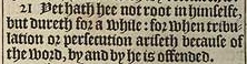 21 Yet hath hee not root in himselfe, but dureth for a while: for when tribulation or persecution ariseth because of the word, by and by he is offended.