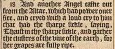 18 And another Angel came out from the Altar, which had power ouer fire, and cryed with a loud cry to him, that had the sharpe sickle, saying, Thrust in thy sharpe sickle, and gather the clusters of the vine of the earth, for her grapes are fully ripe.