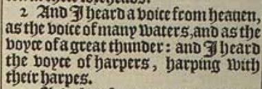 2 And I heard a voice from heauen, as the voice of many waters, and as the voyce of a great thunder: and I heard the voyce of harpers, harping with their harpes.