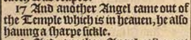 17 And another Angel came out of the Temple which is in heauen, he also hauing a sharpe sickle.
