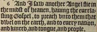 6 And I saw another Angel flie in the midst of heauen, hauing the euerlasting Gospel, to preach vnto them that dwel on the earth, and to euery nation, and kinred, and tongue, and people,