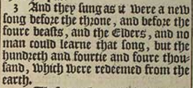 3 And they sung as it were a new song before the throne, and before the foure beasts, and the Elders, and no man could learne that song, but the hundreth and fourtie and foure thousand, which were redeemed from the earth.