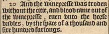 20 And the winepresse was troden without the citie, and blood came out of the winepresse, euen vnto the horse bridles, by the space of a thousand and sixe hundred furlongs.