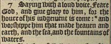 7 Saying with a loud voice, Feare God, and giue glory to him, for the houre of his iudgement is come: and worshippe him that made heauen and earth, *and the sea, and the fountains of waters.[*Psa.146.5 acts 14.15.]