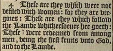 4 These are they which were not defiled with women: for they are virgines: These are they which follow the Lambe whithersoeuer hee goeth: These +were redeemed from among men, being the first fruits vnto God, and to the Lambe.[+Gr. were bought.]
