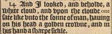 14 And I looked, and beholde, a white cloud, and vpon the cloude one sate like vnto the sonne of man, hauing on his head a golden crowne, and in his hand a sharpe sickle.