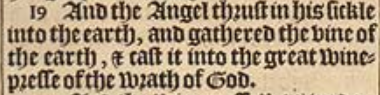19 And the Angel thrust in his sickle into the earth, and gathered the vine of the earth, & cast it into the great winepresse of the wrath of God.